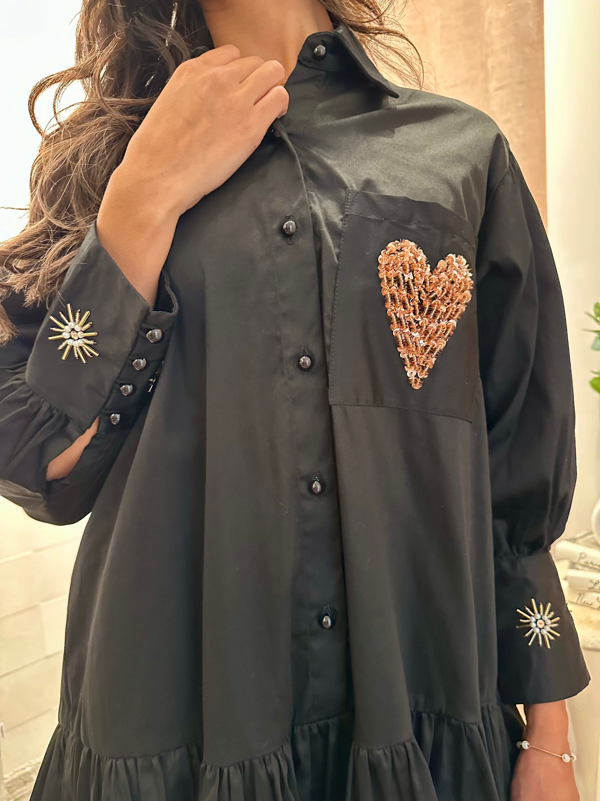 Effortlessly chic with a touch of edge, this handmade black t-shirt dress is a must-have piece for every woman’s wardrobe. Crafted in Colombia, it features a relaxed silhouette that combines comfort and elegance, elevated by the subtle sparkle of coffee-colored stones delicately hand-applied for a refined finish.
